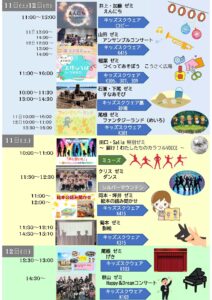 学生、卒業生、教員など約35団体が、J-POP、歌、合唱、ピアノ、吹奏楽、ジャズ、ダンス、電子音楽など多彩なステージを披露。また、楽器体験や縁日、教室展示など子ども向け企画を含めて盛りだくさんの内容です。