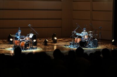 山口智史氏と藤井進也准教授はこれまで取り組んできたドラマーのジストニア研究紹介に加え、YAMAHAと共同開発中の「声でドラムを奏でる」システム〈VXD〉の実演も披露しました。さらに、山口氏が在学中に師事していた恩師・松山修講師との特別共演も行いました。