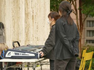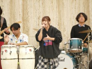 クリストファー・ハーディ先生の演奏会実習「くりゼミ」は、自分の「手」で世界を奏でることをテーマに、ラテン、西アフリカ、中東、南米、手で叩く世界の民族打楽器の演奏法を習得することを目指しています。打楽器の原点を学び、コンサートで実践して、自分のグルーヴを磨き、コミュニケーション&アンサンブル能力をアップさせることを目標にしています。芝生広場に集まった、学生や教職員がくりゼミの素晴らしい演奏を楽しみました。