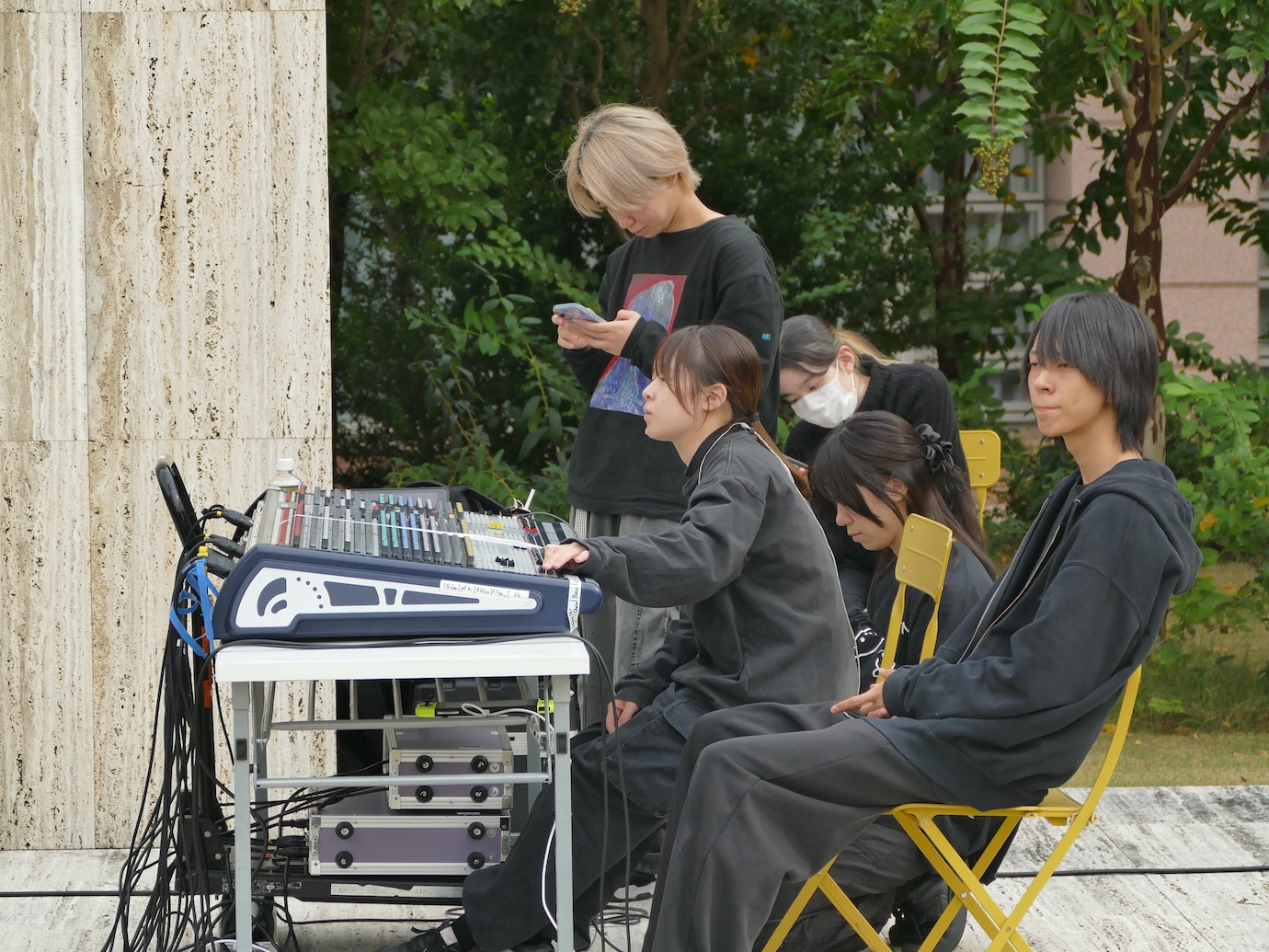 クリストファー・ハーディ先生の演奏会実習「くりゼミ」は、自分の「手」で世界を奏でることをテーマに、ラテン、西アフリカ、中東、南米、手で叩く世界の民族打楽器の演奏法を習得することを目指しています。打楽器の原点を学び、コンサートで実践して、自分のグルーヴを磨き、コミュニケーション&アンサンブル能力をアップさせることを目標にしています。芝生広場に集まった、学生や教職員がくりゼミの素晴らしい演奏を楽しみました。