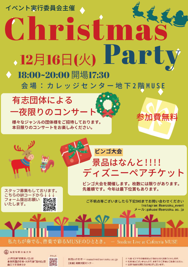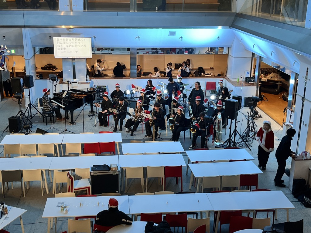 2025年度のStudent Live at Cafeteria MUSE 第35回を12月16日(火)に開催しました。音楽大学イベント実行委員会主催の「クリスマスパーティ2025」では、軽食を楽しみながらロックやジャズの学生バンドの演奏を聴いたり、「ディズニーペアチケット」が当たるビンゴ大会などを通じて、多くの学生が楽しいひとときを過ごしました。