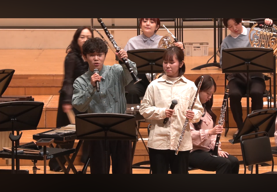 このコンサートは、幼稚園教諭・保育士を志す本学1年生が、日々、保育者になるための理論や技術を学びながら、「こどもをまんなかに」音楽や表現を共に楽しむ経験をどのように実現するかを、クラス単位で創意工夫し、本番を迎えました。冒頭には、本学の選択科目の一つである「ウィンド・バンド(吹奏楽)」の履修学生による演奏を披露しました。