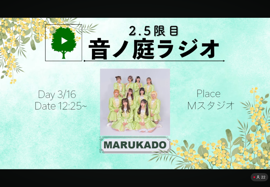3月16日(月)の昼休み、M studioから音楽大学公開ラジオ『2.5限目 音ノ庭ラジオ#43』をライブ配信しました。ゲストにMARUKADOをお迎えし、3月14日(土)と15日(日)に開催された「MIMOSA FESTA 2026」についてのお話やMARUKADOメンバーの所属する各コースについての〇×クイズ、そして「Re.青春」のパフォーマンスをお届けしました。ぜひアーカイブからご視聴ください。